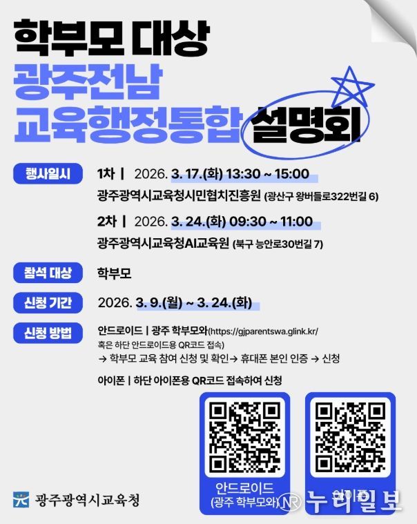 (누리일보) 광주시교육청이 학부모의 교육행정통합 궁금증을 해소하기 위해 두 차례에 걸쳐 ‘광주·전남 교육행정통합 설명회’를 개최한다.