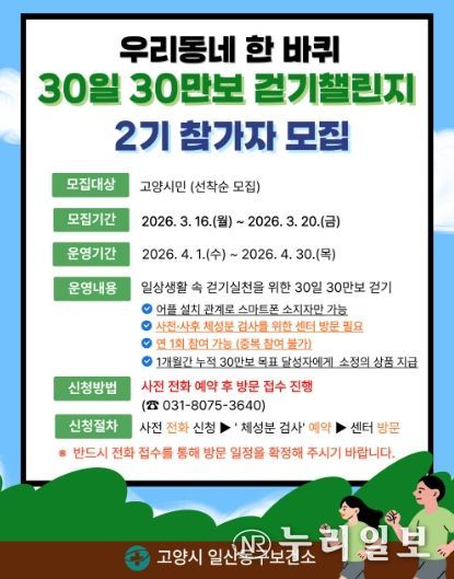 (누리일보) 고양특례시 일산동구보건소는 지역 주민의 기초 체력 증진과 일상 속 신체활동 활성화를 위해 ‘우리동네 한 바퀴 30일 30만보 걷기 챌린지’ 2기 참가자를 오는 16일부터 모집한다고 11일 밝혔다.