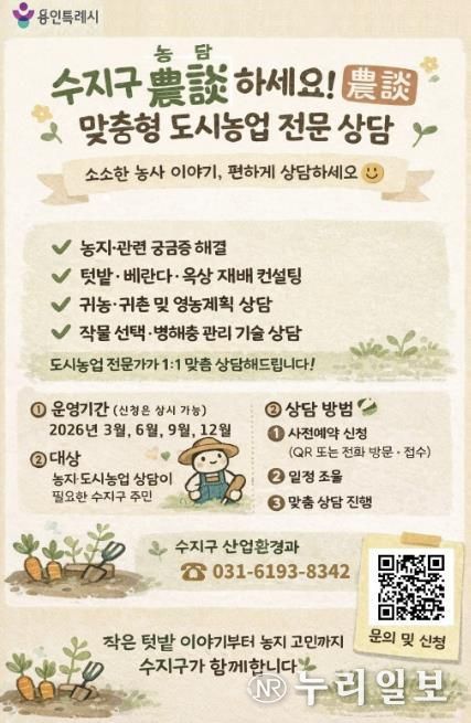 (누리일보) 용인특례시 수지구는 도시농업에 관심 있는 시민을 대상으로 전문 상담 프로그램인 ‘수지구 농담(農談)하세요’를 운영한다고 12일 밝혔다.