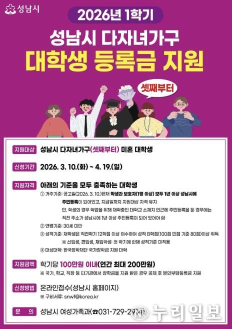 (누리일보) 성남시는 다자녀가구의 경제적 부담을 덜기 위해 셋째 이상 대학생에게 학기당 최대 100만원(연 200만원)의 등록금을 지원한다고 12일 밝혔다.