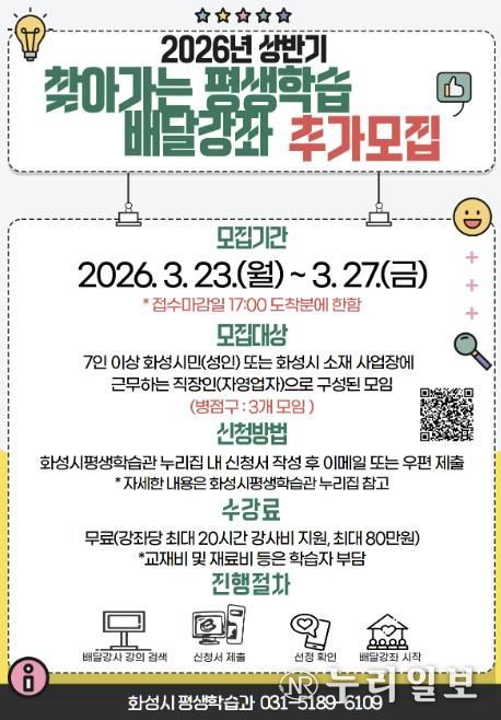 (누리일보) 화성특례시는 시민의 다양한 학습 수요를 반영한 맞춤형 평생학습 프로그램 운영을 위해 ‘2026년 상반기 찾아가는 평생학습 배달강좌’를 추가 모집한다고 밝혔다.