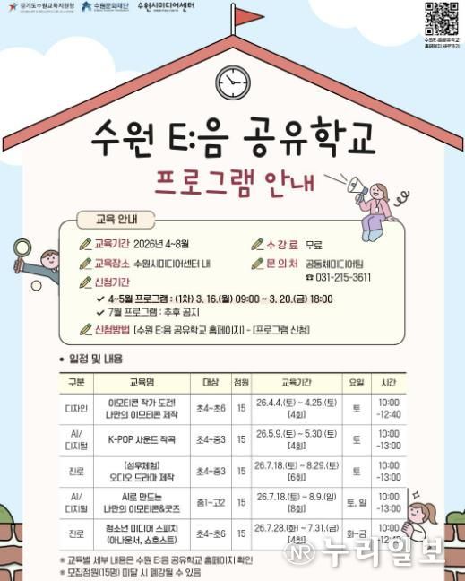 수원시미디어센터는 ‘2026년 수원 E:음 공유학교’ 지역맞춤형 기관 연계 프로그램 운영 기관으로 선정되어, 오는 4월부터 디자인, 사운드, 스피치 등 다채로운 미디어 교육을 본격 가동한다.