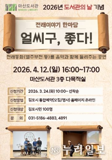 (누리일보) 김포시 마산도서관은 제4회 도서관의 날을 맞아 오는 4월 12일 오후 4시부터 5시까지 마산도서관 3층 다목적실에서 전래이야기 한마당 '얼씨구, 좋다!'를 운영한다.