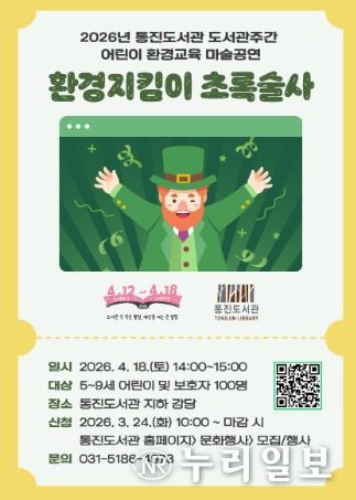 ‘환경지킴이 초록술사’ 공연은 4월 18일 오후 2시부터 3시까지 통진도서관 지하 강당에서 진행된다. 대상은 5~9세 어린이 및 보호자 100명이다. 참여를 원할 경우 3월 24일 오전 10시부터 통진도서관 누리집에서 신청하면 된다.