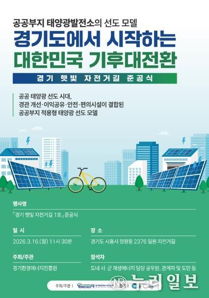 (누리일보) 경기환경에너지진흥원은 16일 시흥시 정왕동 2376일원 자전거길에서 ‘경기 햇빛 자전거길 1호’ 준공식을 개최한다고 13일 밝혔다.