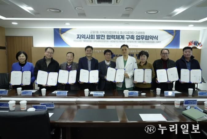 (누리일보) 군포1동 지역리더협의체(주민자치회 등 7개 단체)와 효산의료재단 지샘병원은 지역사회 건강증진 및 상호 협력 강화를 위해 3월 12일 지샘병원에서 업무협약(MOU)을 체결했다.