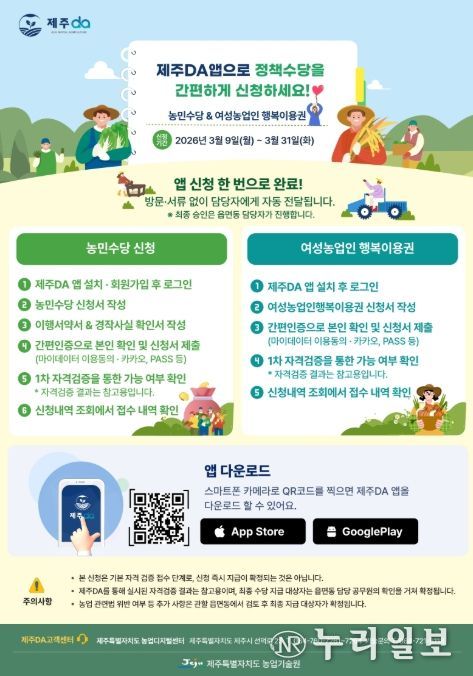 농민수당 및 여성농업인 행복이용권 지원사업 신청기간은 3월 31일까지이며, 제주DA 앱을 통한 비대면 신청 서비스는 3월 9일 시범 운영을 시작해 공공 마이데이터 서비스 승인 절차를 거쳐 3월 16일부터 정식 운영할 예정이다.