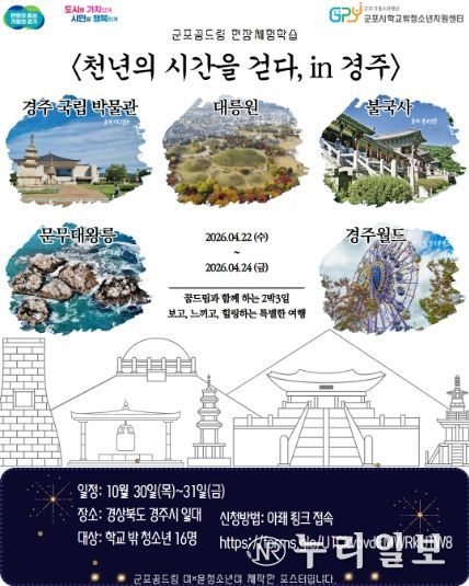 (누리일보) (재)군포시청소년재단(대표이사 김덕희) 군포시학교밖청소년지원센터(센터장 강연미)는 학교 밖 청소년 16명을 대상으로 오는 4월 22일부터 24일까지 2박 3일간 경상북도 경주시 일대에서 ‘역사캠프 현장체험학습 프로그램’을 운영한다고 밝혔다. 참가신청은 구글폼 등을 통해 접수 받은 뒤 신청 내용을 바탕으로 참여 대상자를 선정할 예정이다.