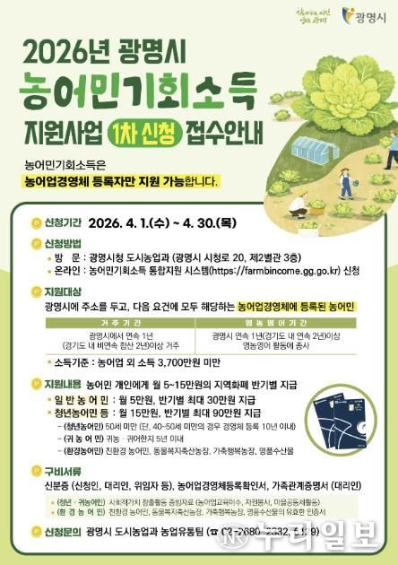 (누리일보) 광명시는 오는 4월 1일부터 4월 30일까지 ‘농어민 기회소득 지원사업 1차’ 신청을 받는다.