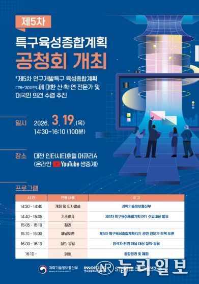 (누리일보) 과학기술정보통신부는 2026년 3월 19일 14시 30분, 대전에서(인터시티호텔, 머큐리 A홀) 제5차 연구개발특구육성 종합계획 공청회를 개최한다.