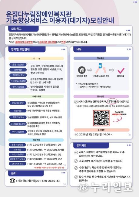 (누리일보) 파주시 운정다누림장애인복지관은 지역 내 장애인의 기능 향상과 일상생활 능력 증진을 위해 ‘기능향상서비스’참여자를 오는 23일부터 상시 모집한다.