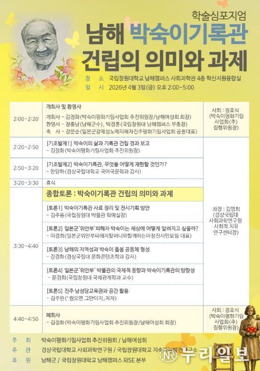 이번 학술 심포지엄은 경상국립대학교 사회과학연구원과 함께 박숙이 기록관 건립을 위해 구성된 ‘박숙이 기록관 건립추진위원회’, 남해여성회, 국립창원대학교 지속가능발전연구소가 공동 주최·주관한다. 사전 신청하면 누구나 참여할 수 있다.