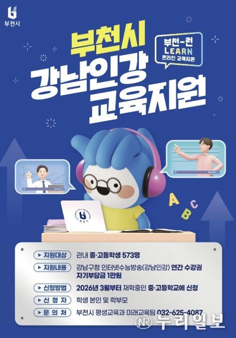(누리일보) 부천시는 2026년 ‘부천-런(Learn) 온라인 교육지원’ 사업을 추진한다고 19일 밝혔다. 이는 지난해에 이어 시행되는 것으로, 관내 중·고등학생들에게 온라인 교육 기회를 제공하고 가정의 사교육비 부담을 완화하는 데 중점을 둔다.