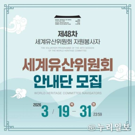 (누리일보) 국가유산청 제48차 세계유산위원회 회의 준비기획단은 7월 부산에서 개최되는 제48차 유네스코 세계유산위원회 회의(48th Session of the World Heritage Committee)에 국내·외 청년들의 국제회의 현장 참여 기회를 제공하기 위하여 '세계유산위원회 안내단(World Heritage Committee Navigators)'의 참가자를 공개 모집한다.