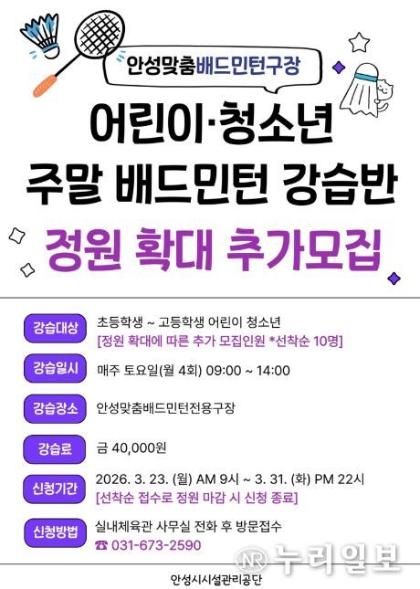 (누리일보) 안성시시설관리공단은 안성 시민 생활체육 활성화를 위해 현재 운영 중인 주말 어린이・청소년 배드민턴 강습반 정원을 확대하고 추가 수강생을 모집한다고 밝혔다.
