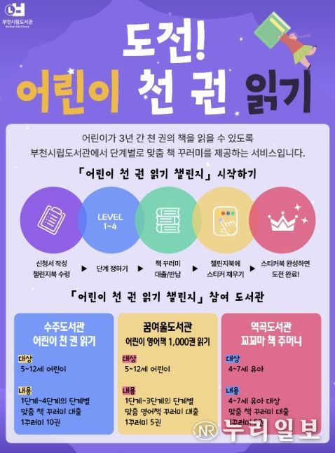 (누리일보) 부천시는 어린이의 체계적인 독서 습관 형성과 도서관 이용 활성화를 위해 기존 수주도서관 중심으로 운영하던 ‘어린이 천 권 읽기 챌린지’를 꿈여울도서관과 역곡도서관까지 확대 운영한다.