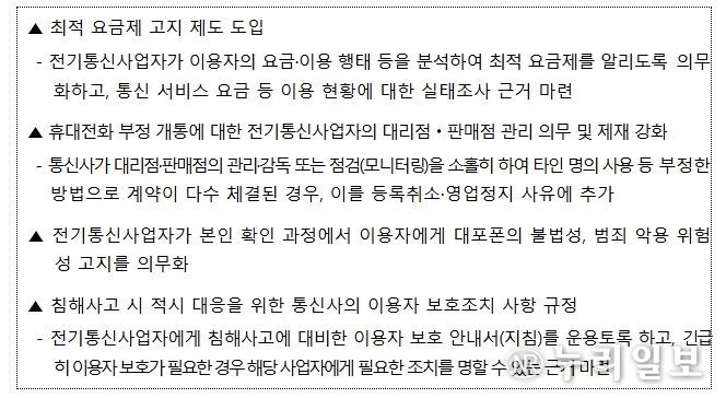이번 전기통신사업법 개정안은 ①통신사업자가 이용자의 데이터 사용 유형(패턴) 등을 분석하여 최적 요금제를 주기적으로 알림으로써 이용자가 합리적인 요금제 선택을 할 수 있도록 지원하고, ②사기전화(보이스 피싱) 등 범죄 예방을 위해 휴대전화 부정 개통과 관련된 통신사업자의 대리점·판매점 관리 의무 및 제재를 대폭 강화하며, ③침해사고 발생 시 통신사업자의 신속한 대응 체계 구축을 위한 이용자 보호 안내서(매뉴얼) 마련 및 과기정통부의 긴급 조치 명령 근거 마련 등의 내용을 포함한다.