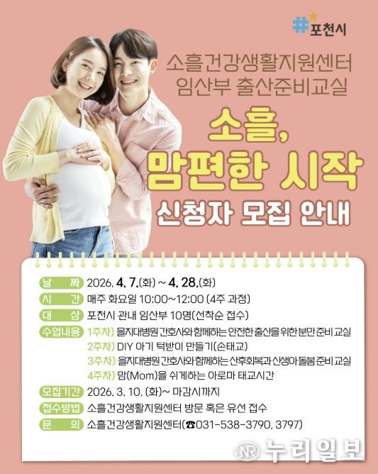 (누리일보) 포천시 소흘건강생활지원센터는 임산부의 건강한 임신과 안전한 출산을 지원하기 위해 임산부 출산준비교실 ‘소흘, 맘편한 시작’ 참여자를 모집한다.