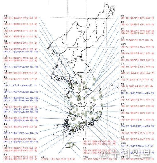 북태평양고기압의 이른 확장으로 6월 말부터 이미 한여름 날씨를 보였고, 7월 하순부터는 티베트고기압의 영향이 더해지면서 기온이 더욱 상승하여 여름철 전국 평균기온은 25.7 ℃로 역대 최고 1위를 기록했다.