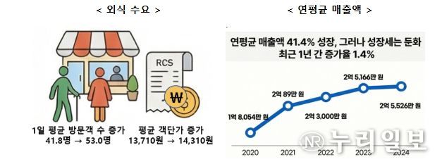 2024년 실적 기준 외식업체 당 연평균 매출액은 2억 5,526만 원으로, 2021년(1억 8,054만 원) 대비 무려 41.4%나 성장했다.