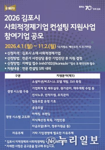 (누리일보) 김포시가 관내 사회적경제기업의 지속 가능한 성장과 자생력 강화를 위해 ‘사회적경제기업 역량강화 컨설팅 지원사업’ 참여기업을 오는 11월까지 수시 모집한다.