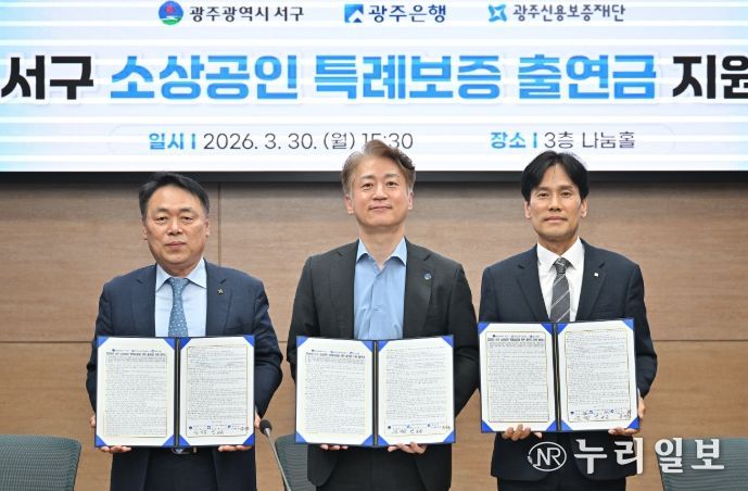 (누리일보) 광주은행은 30일, 광주광역시 서구청에서 김이강 광주광역시 서구청장, 강지훈 광주은행 부행장, 염규송 광주신용보증재단 이사장 및 관계자가 참석한 가운데 ‘서구 소상공인 특례보증 업무협약’을 체결했다고 밝혔다.