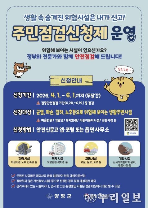 (누리일보) 양평군은 군민의 눈높이에서 지역 사회의 안전 사각지대를 해소하기 위해 ‘2026년 집중안전점검 주민점검신청제’를 본격 운영한다고 밝혔다.