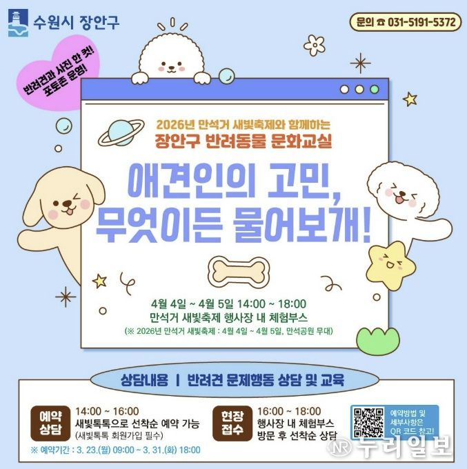 (누리일보) 수원시 장안구가 4월 4일부터 5일까지 장안구 만석공원 내 체험부스에서 시민들을 대상으로 반려동물 문화교실을 추진한다.