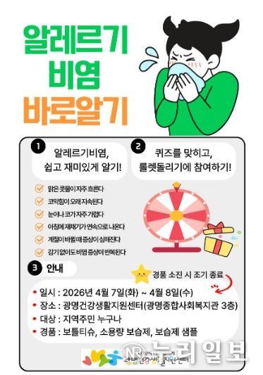(누리일보) 광명시는 시민 알레르기 질환에 대한 인식을 높이고 예방관리를 돕기 위해 오는 7일부터 8일까지 이틀간 ‘아토피·천식 예방관리사업 홍보부스’를 운영한다.