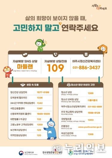 한편, 여주시민은 우울이나 불안 등으로 전문가의 도움이 필요한 경우 자살예방상담전화(109), 정신건강상담전화, 자살예방SNS상담 ‘마들랜’, 여주시정신건강복지센터(부설)자살예방센터를 통해 상담을 받을 수 있다.