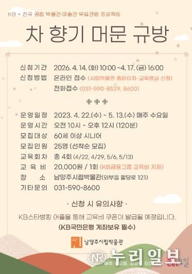 (누리일보) 남양주시는 오는 22일부터 남양주시립박물관이 시니어 대상 체험 프로그램 ‘차 향기 머문 규방’ 운영하고, 이에 앞서 14일부터 참여 신청을 받는다고 7일 밝혔다.