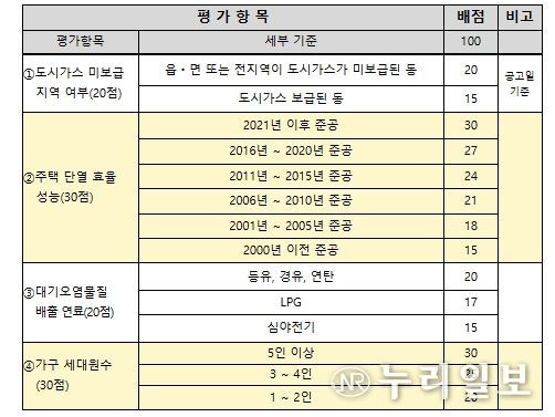 심사는 기후부 지침에 따른 우선 지원 기준을 반영해 평가항목별 배점을 합산한 후 고득점순으로 선정한다. 우선 지원 기준은 대기오염물질을 많이 배출하는 보일러 사용가구, 단열 효율이 높은 가구, 도시가스 미공급 지역 가구, 취약계층 가구이다. 탈락 가구는 예비 대상자로 등록해 결원 발생 시 순위에 따라 선정된다.