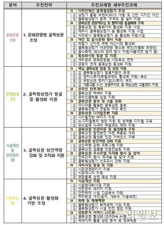 4대 전략과 38개 세부과제를 축으로, 3년간 총 212억 원 규모의 예산을 투입할 계획이다. 4대 전략은 ▲문화관광형 골목상권 조성 ▲골목형상점가 발굴 및 활성화 지원 ▲상인 역량 강화 및 조직화 지원 ▲골목상권 활성화 기반 조성으로 구성된다.