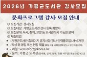 (누리일보) 가평군도서관은 2026년 도서관 문화프로그램을 운영할 강사를 공개 모집한다고 11일 밝혔다. 모집 대상은 가평군도서관 문화프로그램 운영을 희망하는 강사로 거주지 제한은 없으나 가평군 거주자 또는 인근 지역의 강사를 우선 모집한다. 모집 분야는 유아부터 성인을 대상으로 하는 독서문화 프로그램을 비롯해 취미, 교양, 체험 등 도서관에서 운영 가능한 분야이다. 모집 기간은 올해 12월부터 상시 모집하고 있으며 제출서류를 준비해 가평군 도서관 4개소(한석봉, 설악, 청평, 조종)에 방문 또는 가평군도서관 홈페이지 공지사항에 기재된 이메일로 제출하면 된다. 제출된 서류는 가평군도서관 강사인력풀에 등록 및 관리되며, 추후 도서관 문화 프로그램 운영을 위한 강사로 활동할 수 있다. 기타 자세한 내용은 가평군도서관 홈페이지 공지사항을 참고하거나 가평군도서관으로 문의하면 안내받을 수 있다. 도서관 관계자는 “이번 공개 모집을 통해 유능하고 열정 있는 강사를 모집해 지역 주민에게 다양하고 유익한 프로그램이 운영될 수 있도록 최선의 노력을 하겠다”고 밝혔다.