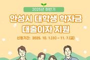 (누리일보) 안성시는 오는 10월 1일부터 11월 7일까지 ‘2025년도 하반기 안성시 대학생 학자금 대출이자’ 지원 신청을 받는다. 지원 대상은 공고일(2025. 10. 1.)기준으로 안성시에 주민등록 주소를 두고 재학(휴학 포함)중인 대학(원) 재학생(휴학생)이다. 지원 대상자로 선정되면 대상자가 한국장학재단에서 대출받은 학자금에 대한 2025년 상반기(1월~6월) 발생 이자를 안성시가 지급하게 된다. 지급은 대출 계좌 원리금에서 차감하는 방식으로 진행되며, 지원 내역은 12월 지급이 확정된 시점에 한국장학재단 인터넷 홈페이지에서 확인할 수 있다. 신청 방법은 주소지 읍·면·동 행정복지센터 또는 안성시청(미래교육과)으로 방문하여 접수하면 된다. 안성시 관계자는 “학자금 대출이자 지원 사업을 통해 대학생들의 학업 부담을 완화하고, 학업에 전념할 수 있는 환경을 조성하는데 도움이 되길 바란다”고 전했다.