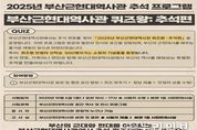 (누리일보) “추석, 부산근현대역사관에서 가족과 함께 부산의 근현대사를 배우는 시간이 되어보세요!” 부산근현대역사관은 추석 연휴를 맞아 오는 10월 6일 오전 10시부터 오후 5시까지 시민참여 프로그램 '2025년 부산근현대역사관 퀴즈왕: 추석날편'을 운영한다고 밝혔다. 이번 프로그램은 역사관 본·별관과 전시를 관람하며 부산의 근현대사 퀴즈를 풀어보는 체험형 행사로, 역사관 관람객 누구나 참여할 수 있다. 퀴즈는 부산 근현대사의 흐름과 공간의 특성을 반영해 총 6개 영역으로 구성된다. ▲‘상설전시’ 영역에서는 개항과 근대 부산, 일제강점기와 독립운동, 피란수도 부산, 산업화와 민주화까지 부산의 역사를 한눈에 살펴본다. ▲‘본관·별관 탐방’ 영역에서는 건물과 공간이 지닌 역사적 의미를 직접 체험할 수 있다. ▲‘문화와 인물’ 영역에서는 부산 근현대사에 중요한 발자취를 남긴 인물들의 삶과 업적을 돌아본다. 누구나 무료로 참여할 수 있으며, 퀴즈의 정답을 모두 맞히면 선착순 500명에게 한국은행에서 제공하는 소정의 기념품을 제공한다. 참여방법은 본관 1