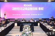 (누리일보) 대한민국교육감협의회(회장 강은희 대구광역시교육감)는 1월 29일, 경기도 성남시 더블트리바이힐튼서울판교호텔에서 제106회 총회를 개최했다. 이번 총회에서는 전국 시도교육감 및 교육청 관계자, 협의회 사무국 관계자 약 200명이 참석하여 '사립학교의 ‘공직자 이해충돌방지법’ 적용을 위한 법령 개정 건의' 등 5개 안건을 심의·의결했고, '행정통합 추진에 따른 경과 및 쟁점'에 대해 교육의제로 토의했다. 이날 심의 안건은 ▲사립학교의 ‘공직자 이해충돌방지법’ 적용을 위한 법령 개정 건의, ▲외부강의 등 요청 표준서식 마련 요구, ▲‘보호자 협조·동의 관련’ 기초학력 보장법 및 동법 시행령 개정 요청, ▲교육활동 침해 학생의 학적변동 제한을 위한 법률 개정 건의, ▲학습지원 소프트웨어 관련 초·중등교육법 개정 제안으로 모두 5개의 안건을 심의·의결했고, 지난해 12월 11일 실무협의회를 통해 전국 17개 시도교육청의 전원 합의 과정을 거쳤다. 다음으로 2개 교육청에서 우수사례를 발표했는데, ▲(경기) 시·공간 경계를 넘어 세계를 잇는 한국어교육 온라인 경기한국어랭귀지스쿨(KLS 3섹터) 구축, ▲(충남)