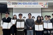 (누리일보) 경상국립대학교 지속가능발전센터는 2월 11일 칠암캠퍼스에서 ‘2025년 GNU-SDGs/ESG 서포터즈 수료식’을 개최했다. 이날 수료식은 지속가능발전센터 소속 직원들이 참석한 가운데 센터장 인사말을 시작으로 수료증 수여 순으로 진행됐다. 참석자들은 한 해 동안 적극적으로 활동한 서포터즈 학생들의 노고를 격려하고 활동 성과를 공유했다. ‘GNU-SDGs/ESG 서포터즈’는 재학생이 직접 프로그램을 기획·운영하고 성과를 환류하는 학생 주도형 활동으로, 교내외 SDGs(지속가능발전목표) 및 ESG 가치 확산과 실천 문화 정착을 목적으로 운영되고 있다. 2025년 제4기 GNU-SDGs/ESG 서포터즈는 지난 5월 발대식을 시작으로 ▲대동제 SDGs 체험부스 ▲분리수GO! 캠페인 부스 ▲공정무역 인식 제고 캠페인 부스 등 다양한 프로그램을 기획·운영하며 학내 구성원의 참여를 이끌어 냈다. 이로써 일상 속 실천을 기반으로 한 지속가능성 인식 확산에 기여했다. 김영철 경상국립대학교 지속가능발전센터장은 “GNU-SDGs/ESG 서포터즈는 학생들이 주체가 되어 지속가능성과 ESG 가치를