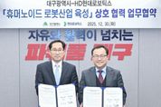 (누리일보) 대구광역시는 12월 30일 오후 2시 30분, 산격청사 제1대회의실에서 국내 로봇 시장 점유율 1위 기업인 HD현대로보틱스와 ‘휴머노이드 로봇 산업 육성’을 위한 업무협약(MOU)을 체결했다. 이번 협약은 대구시와 HD현대로보틱스가 협력해 지역경제의 핵심 성장 동력으로 육성 중인 휴머노이드 로봇 산업의 저변을 확대하고, 관련 생태계를 조성하는 중요한 첫걸음이다. 특히 양 기관은 대구 로봇산업의 질적 도약을 위해 ‘로봇 국가첨단전략산업 특화단지’ 지정에 역량을 집중하고, 대구를 대한민국 로봇 산업의 전초기지로 구축한다는 구상이다. 또한, 대구시는 HD현대로보틱스 대구 본사 공장의 제조 혁신을 위한 ‘AI 팩토리 선도프로젝트’를 추진하고, 로봇 실증 인프라 확충을 위한 국비 예산 확보 등 정책적 지원을 강화할 방침이다. HD현대로보틱스는 글로벌 로봇 시장 수요 증가에 선제적으로 대응하기 위해 현재 연간 8,000대 수준인 생산 능력을 20,000대 규모로 2.5배 확대할 계획이다. 이를 위해 제조 공정에 AI 기술을 본격 도입하고, 자동화율을 기존 50%에서 80%까지 끌어올릴 예정이다.