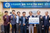 (누리일보) 진주 동명고등학교를 졸업한 수의사들로 구성된 ‘동수회’(회장 김도경 동명대학교 반려동물대학 학장)가 경상국립대학교 수의과대학 설립 70주년 기념행사 후원을 위해 발전기금을 출연했다. 발전기금 전달식은 9월 19일 오후 3시 대학본부 3층 접견실에서 열렸다. 이번에 전달한 발전기금은 동수회 소속 회원들이 뜻을 모아 마련한 2000만 원으로, 수의과대학 설립 70주년 기념사업의 원활한 진행과 후학 양성을 위한 행사 지원에 사용될 예정이다. 이로써 현재까지 수의과대학 설립 70주년 기념행사 후원금은 총 6120만 원에 달한다. ‘동수회’는 진주 동명고등학교를 졸업한 수의사 약 70명으로 구성된 단체로, 2000년 결성 이후 현재까지 활발한 교류와 친목을 이어오며 수의학 발전과 고향 후배들을 위해 꾸준히 뜻을 모아 왔다. 이번 발전기금 출연은 “경상국립대학교 수의과대학의 역사와 전통을 축하하고, 고향의 대학과 후배들의 발전에 작은 보탬이 되고 싶다.”라는 회원들의 뜻을 반영한 것이다. 이날 행사에는 권진회 총장을 비롯해 이성갑 교학부총장, 김봉조 기획처장, 김경수 국제협력부처장, 수의과대학 김상현 학장,