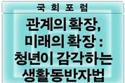(누리일보) 6 3 지방선거를 앞두고 다양한 청년정책이 발표되는 가운데, 청년 당사자가 직접 청년정책으로서 생활동반자법의 의미와 필요성을 조망하는 국회포럼이 개최된다. 이날 포럼에는 50여 명의 청년 당사자가 참석해 생활동반자법에 대한 의견을 나눌 예정이다. 기본소득당 용혜인 의원과 기본소득당 청년 대학생위원회는 4월 5일 오후 2시 국회의원회관 제3세미나실에서 '관계의 확장, 미래의 확장 : 청년이 감각하는 생활동반자법' 국회포럼을 개최한다. 용혜인 의원은 지난 1월 세상을 바꾸는 청년 캠페이너를 양성하는 ‘링크로스 아카데미’ 3기를 개최하고, 우수 참가자를 대학생특보로 위촉했다. 이번 국회포럼은 대학생특보가 청년 당사자로서 청년에게 필요한 제도 변화를 모색하며, 직접 포럼 기획과 진행을 맡았다. 이번 포럼에서는 용혜인 의원이 직접 위촉한 대학생특보 6인(김다희, 김서현, 나하은, 오채은, 이루리, 한빛나)이 여는 발제를 맡아, 청년의 삶에서 생활동반자법이 가지는 의미를 설명한다. 토론으로는 은둔고립청년 자조모임센터 '두더집' 운영자인 김예림 씨즈 전문위원, 이호림 무지개행동 공동대표, 변수정