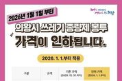 (누리일보) 의왕시가 물가 상승 및 경기 침체로 인한 시민들의 경제적 부담을 완화하기 위해 2026년 1월 1일부터 쓰레기 종량제봉투 판매가격을 인하한다. 이번 가격 인하 대상은 일반용 및 재사용 종량제봉투이며, ▲5리터 봉투는 190원에서 150원으로 ▲10리터 봉투는 350원에서 300원으로 ▲20리터 봉투는 680원에서 550원으로 인하된다. 또한, ▲50리터 봉투는 1,700원에서 1,400원으로 ▲75리터 봉투는 2,630원에서 2,100원으로 각각 조정된다. 가격 인하 이전에 구매한 종량제봉투는 그대로 사용 가능하고, 음식물 종량제봉투, 공사장 생활폐기물 포대, 대형폐기물 신고필증은 가격 등은 변동 없다. 김성제 시장은 “종량제봉투는 시민 생활과 밀접한 만큼, 이번 가격 인하가 가계 부담 완화에 도움이 되길 바란다”며, “가격 인하 시점이 2026년 1월 1일이므로, 그전까지 각 가정에서 필요한 양만 구입해 주시길 바란다”고 전했다.