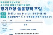 (누리일보) 제주특별자치도는 제주지역 요양보호사 인력수급 문제 해결을 위해 오는 11월 14일 오후 2시 호텔샬롬제주 컨벤션홀에서 전문가와 현장 종사자들이 한자리에 모여‘장기요양 돌봄 정책 포럼’을 개최한다고 밝혔다. 이번 포럼은 제주장기요양요원지원센터(센터장 김성건) 주관으로 열리며, 도내 장기요양기관 대표 및 종사자 등 약 120여 명이 참석할 예정이다. 급속한 고령화로 인한 돌봄 인력 부족 문제를 진단하고, 제주지역의 지속 가능한 인력 수급 체계 구축 방안을 모색하기 위해 마련됐다. 포럼은 개회식을 시작으로 주제발표, 종합토론, 질의응답 순으로 진행된다. 첫 번째 주제발표에서는 이희승 박사(국민건강보험공단 건강보험연구원 장기요양정책연구센터 부연구위원)가‘전국 요양보호사 인력 현황과 향후 과제’를 주제로 전국 단위의 인력 현황과 정책적 과제를 짚는다. 이어 김재희 센터장(제주연구원 고령사회연구센터)이‘제주지역 요양보호사 인력 수급 전망 및 정책 과제’를 주제로 발표하며, 제주지역의 현실과 향후 정책 방향을 제시할 예정이다. 이후 진행되는 종합토론에서는 도내 장기요양기관장