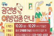 (누리일보) 파주시는 반려견을 동반한 야외활동이 잦아지는 가을을 맞아 오는 20일부터 29일까지 생후 3개월 이상의 임신하지 않은 개를 대상으로 광견병 예방접종을 실시한다고 밝혔다. 광견병은 바이러스에 의해 사람과 동물 모두에게 감염될 수 있는 인수공통전염병으로, 잠복기가 상당히 길고 증세가 나타날 경우 치사율이 매우 높기 때문에 사람과 반려동물 모두를 위해 반려견은 매년 1회 반드시 예방접종할 것을 적극 권장하고 있다. 시는 하반기 광견병 예방사업을 위해 예방백신 4,500마리 분을 무상 지원하며, 예방접종을 희망하는 반려견 보호자는 33개 지정 동물병원을 방문해 시술비 1만 원만 부담하면 접종이 가능하다. 참여 동물병원 목록은 파주시청 누리집 공고문을 통해 확인할 수 있다. 동물병원이 없는 읍면지역은 시에서 직접 수의사를 파견해 순회접종을 진행하며, 이 경우 접종비 전액을 시에서 지원할 방침이다. 읍면지역 순회접종 일정은 해당 읍면 행정복지센터 산업팀에 문의하면 된다. 아울러 파주시는 야생동물의 광견병 전파를 막기 위해 광견병 미끼백신을 너구리 등 야생동물이 자주 출몰하는 관내 야산에 살포하는