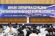 (누리일보) 대전시교육청은 11월 8일'제5회 대전광역시교육감배 2025 전국 유소년 드론축구대회'를 배재대학교 21세기관 스포렉스홀에서 개최하여 성공적으로 마무리했다고 밝혔다. 이번 대회는 드론 산업이 주도하는 4차 산업혁명 시대에 걸맞은 창의ㆍ융합형 드론 인재 양성을 목적으로, 전국 초ㆍ중학교 유소년 드론축구팀 24개 팀이 참가해 열띤 경쟁을 펼쳤다. 참가팀은 예선전을 시작으로 16강, 8강, 4강, 결승에 이르는 토너먼트를 거치며 갈고닦은 기량을 발휘했다. 결승전에서는 구미신당팀(구미신당초등학교)이 SCJ YOUTH팀(충주덕신초, 충주중앙탑초, 충주금릉초 연합팀)을 상대로 2대 1의 세트 스코어로 승리하며 2025년 챔피언의 자리에 올랐다. 대전에서는 장동초등학교가 동상을 수상했다. 입상한 1~4위 팀에게는 대전광역시교육감상과 트로피가 수여됐다. 대전시교육청은 지난 2021년, 전국 최초로 유소년 드론축구대회를 출범한 이래 올해로 5년재 전국 규모로 개최해오고 있다. 이번 대회는 단순한 스포츠 경기를넘어, 미래 과학도시 대전의 이미지 제고, 청소년들의 창의적 진로 탐색 기회 확대, 드론 콘텐츠 산업과 지역