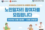 (누리일보) 광주광역시는 노인공익활동사업, 노인역량활용사업 등 ‘2026년 노인일자리 사업’ 참여자를 12월 1일부터 12일까지 모집한다. 광주시는 2026년 노인일자리사업에 1574억원의 예산을 투입해 3만6440명의 어르신에게 일자리를 제공하며, 5개 자치구와 5개 시니어클럽 등 72개 일자리 수행기관에서 다양한 사업을 추진한다. 모집인원은 사업유형별로 ▲노노케어 등 노인공익활동사업 2만6479명 ▲보육시설보조 등 노인역량활용사업 6038명 ▲매장운영 등 공동체사업단 2754명 ▲민간업체 취업지원(취업알선형) 사업 1169명이다. 모집대상은 광주시 거주 어르신으로, 노인공익활동사업은 65세 이상(일부 60세 이상) 기초연금수급자 등 기준을 충족한 어르신이다. 노인역량활용사업은 65세 이상(일부 60세 이상), 공동체사업단·취업지원(취업알선형)은 60세 이상 어르신이 신청할 수 있다. 단, 국민기초생활보장법의 생계급여 수급자, 국민건강보험 직장가입자, 장기요양보험 등급판정자(1~5등급), 다른 부처 일자리 사업 참여자 등은 모집 대상에서 제외된다. 신청은 신분증·주민등록등본·관련 자격