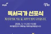 (누리일보) 파주시는 오는 11일 15시, 파주출판도시 지혜의숲 대회의실에서 ‘파주시 독서국가 선포식’을 개최하고 책 읽는 도시를 넘어 ‘독서국가’로 나아가기 위한 힘찬 출발을 알린다. 이번 선포식은 지난 1월 국회의원관에서 열린 ‘독서국가 선포식 및 독서국가 추진위원회 출범식’의 취지에 발맞춰, 인공지능(AI) 시대에 대응하는 독서교육의 국가적 전환 움직임에 동참하고, 책과 도서관의 도시이자 출판산업의 중심지라는 도시의 강점을 바탕으로 시민과 함께하는 독서 생태계를 확대하기 위해 마련됐다. 이날 행사에는 도서관·교육·출판·서점 관계자와 시민 등 200여 명이 참석할 예정이며, ▲독서국가 선언문 발표 ▲대형 붓글씨 시연 ▲문단계의 아이돌이자 국회 독서국가 추진위원회 공동위원장인 박준 작가의 ‘읽는 하루’강연을 펼칠 예정이다. 파주시는 이번 선포식을 계기로 독서문화 확산 정책을 더욱 체계화해 시민 일상 속에 책 읽는 문화를 더욱 깊이 뿌리내리게 할 계획이다. 이번 행사는 시민 누구나 참여할 수 있으며, 참가 신청은 파주시도서관 누리집 또는 홍보물 내 정보 무늬(QR코드)를 이용하면 되고, 문의사항은