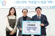 (누리일보) 안양시는 지난 29일 ㈜미미로부터 이웃돕기 성금 1천만원을 기탁받았다고 30일 밝혔다. 이날 시청 접견실에서 열린 성금 전달식에는 최대호 안양시장과 조인주 ㈜미미 회장, 조예서 전무 등이 참석했다. ㈜미미는 만안구 덕천로에 소재한 기업으로 용역·청소·경비·주택업·건물종합관리 등 다양한 분야에서 사업을 운영하고 있으며, 지역사회 나눔과 사회공헌 활동에도 꾸준히 동참하고 있다. 이번에 기탁된 성금은 안양시 이웃돕기 성금으로 사용되며, 저소득층 건강보험료 지원과 취약계층 물품 지원 등 관내 어려운 이웃을 돕는 데 활용될 예정이다. 조인주 회장은 “지역사회로부터 받은 사랑을 다시 이웃과 나누고자 성금을 기탁하게 됐다”며 “작은 정성이지만 어려운 분들께 도움이 되기를 바란다”고 전했다. 최대호 안양시장은 “연말을 맞아 따뜻한 나눔을 실천해 주셔서 감사드린다”면서 “성금은 저소득층과 취약계층 등 도움이 절실한 이웃들에게 투명하고 공정하게 전달하겠다”고 말했다.