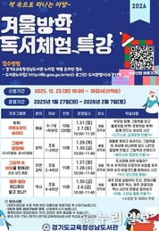 (누리일보) 경기도교육청성남도서관이 겨울방학을 맞은 학생들과 학부모를 대상으로 ‘겨울방학 독서교실과 겨울방학 독서체험 특강’을 진행한다. 이번 프로그램은 어린이들에게 다양한 독서문화 체험의 기회를 제공하여 독서 흥미 유발과 올바른 독서 습관 형성을 위해 마련됐다. 겨울방학 독서교실은 2026년 1월 20일부터 23일까지 4일간 성남지역 초등학교 4학년을 대상으로 운영된다. 주요 프로그램은 ▲진로를 주제로 한 독서 수업과 체험 활동 ▲도서관 이용 및 미디어교육 ▲아침독서와 독서노트 쓰기 등이다. 겨울방학 독서체험 특강은 2026년 1월 27일부터 2월 7일까지 유아(6~7세)와 초등학생, 학부모를 대상으로 진행된다. 주요 프로그램은 ▲톡톡! 아트&창의 놀이터 ▲그림책 팝업북! 리사이클링, 업사이클링 ▲그림책 속 비밀을 밝혀라! ▲'제주 탐라'어디까지 알고 있니? 등으로 예술, 문학, 자연과학, 역사 분야의 창의체험 프로그램으로 진행된다. ‘겨울방학 독서교실과 겨울방학 독서체험 특강’의 참가자는 23일부터 경기도교육청성남도서관 누리집을 통해 선착순으로 모집한다. 우