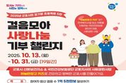 (누리일보) 군포시 산본보건지소는 오는 10월 13일부터 31일까지(19일간) 국민건강보험공단 군포지사와 함께하는 '걸음모아 사랑나눔' 기부챌린지를 운영한다. ‘걸음모아 사랑나눔’ 기부챌린지는 2023년부터 군포시와 국민건강보험공단 군포지사가 협력해 추진해 온 사회공헌형 걷기 사업이다. 시민들이 일상 속에서 걸음을 모아 목표를 달성하면 이를 기부로 연계해 취약계층에 전달하는 방식으로 진행되며 시민과 지역 내 기업·단체가 함께 참여해 건강한 나눔 문화를 지역사회에 확산시키고 있다. 기부챌린지는 군포시민 누구나 참여할 수 있으며 참여 기간은 10월 13일부터 31일까지이다. 참여방법은 워크온 앱을 설치한 뒤 ‘군포시 공식 커뮤니티’에 가입해 챌린지에 참여하면 된다. 챌린지 기간 동안 누적 목표 걸음 수 1억 5천만보를 달성하면 국민건강보험공단 군포지사에서 기부하는 총 100만 원의 기부금이 관내 아동복지시설과 지역아동센터 2곳에 전달될 예정이다. 김미경 군포시 보건소장은 “이번 챌린지는 단순히 건강을 위한 걷기를 넘어 시민 한 분 한 분의 발걸음이 모여 취약계층을 돕는 소중한 나눔으로 이어진다는 데 큰 의미가 있다